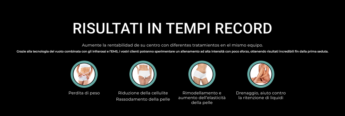 Grazie alla combinazione di vuoto + infrarossi + EMS, i clienti possono vivere sessioni ad alta efficacia con impegno ridotto, percependo benefici dalla prima seduta.