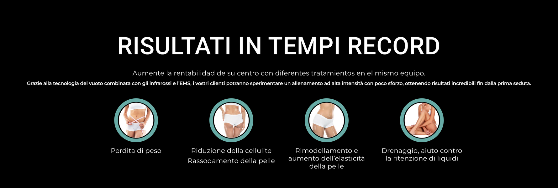 | Benefici | Perdita di peso, riduzione cellulite, drenaggio liquidi, rimodellamento, aumento elasticità e tono |